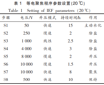 參照Bio-Rad公司雙向電泳實際操作技術(shù)性指南及本精英團隊早期已探究出鯰魚肌原纖維蛋白質(zhì)的雙重凝膠電泳技術(shù)性(twodimensionalgelelectrophoresis,2-DE)開展實驗。將少量的已定量分析蛋白水溶液與凝固上樣緩沖溶液(含7mol/L尿素溶液、2mol/L硫脲、4%CHAPS、65mmol/LDTT、0.2%媒介兩性關(guān)系電解質(zhì)溶液和0.001%溴酚藍)充足混和,選用17cm,pH4~7的IPG預制構(gòu)件干密封膠條開展等電對焦,100μg,300μL積極凝固上樣,著色方法為硝酸銀上色。等電對焦程序流程基本參數(shù)如表1所顯示。