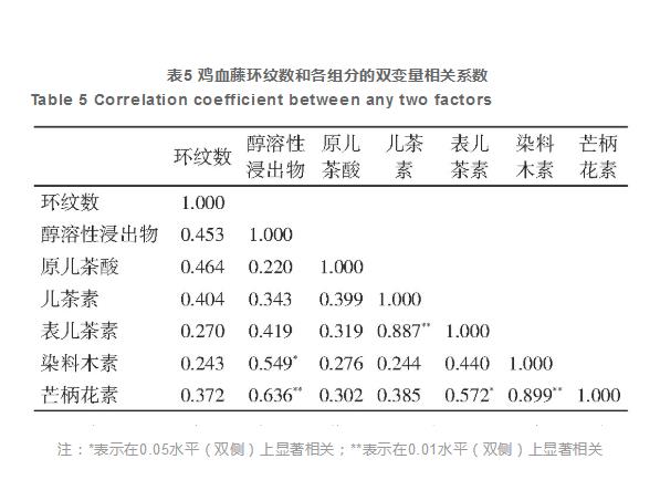 由表5得知,環(huán)紋數(shù)與醇可溶浸出物及五個成分的關(guān)聯(lián)性均不明顯。在其中醇可溶浸出物成分與染料木素成分具備明顯關(guān)聯(lián)性,與芒柄花素成分具備極明顯關(guān)聯(lián)性;表兒茶素成分與兒茶酸成分具備十分明顯關(guān)聯(lián)性,與芒柄花素具備明顯關(guān)聯(lián)性;染料木素與芒柄花素具備十分明顯關(guān)聯(lián)性。