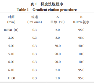 WatersAcquityUPLCTMBEHC18柱(100mm×2.1mm,1.7μm);進(jìn)樣量5μL;柱溫30℃。梯度方向過(guò)柱程序流程見(jiàn)表1。