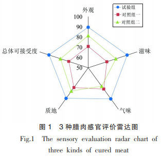 如圖所示1所顯示,實(shí)驗(yàn)組的感觀得分明顯超過(guò)其他組(P<0.05),其整體可接受程度得分達(dá)到90.5。與實(shí)驗(yàn)組對(duì)比,實(shí)驗(yàn)組咸肉內(nèi)外色調(diào)勻稱艷麗,頗具胃口,外型接受程度最大,明顯好于其他組咸肉;對(duì)照實(shí)驗(yàn)1和對(duì)照實(shí)驗(yàn)2的外界色調(diào)均偏暗,內(nèi)部各自發(fā)白和偏粉色,色調(diào)不均勻一,視覺(jué)效果可接受程度不佳;市售組生抽色太重,外界偏深褐色,內(nèi)部呈淡粉色。因而3組咸肉的外型感觀得分?jǐn)?shù)據(jù)顯示:實(shí)驗(yàn)組>對(duì)照實(shí)驗(yàn)2>對(duì)照實(shí)驗(yàn)1。在口味層面,實(shí)驗(yàn)組咸淡適中,咬合的環(huán)節(jié)中摻雜著調(diào)味料所釋放的香味,不油不油膩,硬軟適度;對(duì)照實(shí)驗(yàn)1和對(duì)照實(shí)驗(yàn)2口味略低實(shí)驗(yàn)組,咬合余味偏咸,在其中對(duì)照實(shí)驗(yàn)1肉香氣不濃厚,對(duì)照實(shí)驗(yàn)2雖肉香氣適度,但缺乏調(diào)味料所授予的與眾不同色香味。