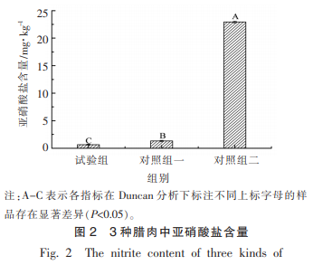 如圖所示2所顯示,實(shí)驗(yàn)組、對(duì)照實(shí)驗(yàn)1、對(duì)照實(shí)驗(yàn)2中的硝酸鹽成分具備明顯差別(P<0.05),各自為0.64,1.31,22.93mg/kg。在其中,對(duì)照實(shí)驗(yàn)2的成分最大,這也是因?yàn)槠渫庠葱约由狭?u>亞硝酸鈉而致。亞硝酸鈉的含量超標(biāo)準(zhǔn)是腌臘肉產(chǎn)品中主要的安全難題,除開(kāi)食材腌漬全過(guò)程?hào)|西方源加上的亞硝酸鈉外,微生物菌種的胺化和生物固氮也可以將肉食品中的中氮化學(xué)物質(zhì)轉(zhuǎn)換成亞硝酸鈉。實(shí)驗(yàn)組和對(duì)照實(shí)驗(yàn)1中也存有亞硝酸鈉,但實(shí)驗(yàn)組里的硝酸鹽成分明顯少于對(duì)照實(shí)驗(yàn)1(P<0.05),這與咸肉生產(chǎn)過(guò)程中應(yīng)用混配菌種發(fā)醇相關(guān)。Esmaeilzadeh等將乳酸菌PTCC1058,發(fā)醇乳酸桿菌PTTC1638及兩株菌構(gòu)成混和發(fā)酵飼料注射到發(fā)醇臘腸上,發(fā)覺(jué)臘腸中殘余亞硝酸鈉的質(zhì)量濃度別減少86.6%,76.1%,81.9%。除此之外,Kilic等研究表明pH值與亞硝酸鈉含量呈成正比。在B6和RC4發(fā)醇產(chǎn)酸的標(biāo)準(zhǔn)下,RC4可以迅速溶解亞硝酸鈉進(jìn)而減少咸肉中亞硝酸鈉含量。