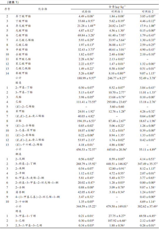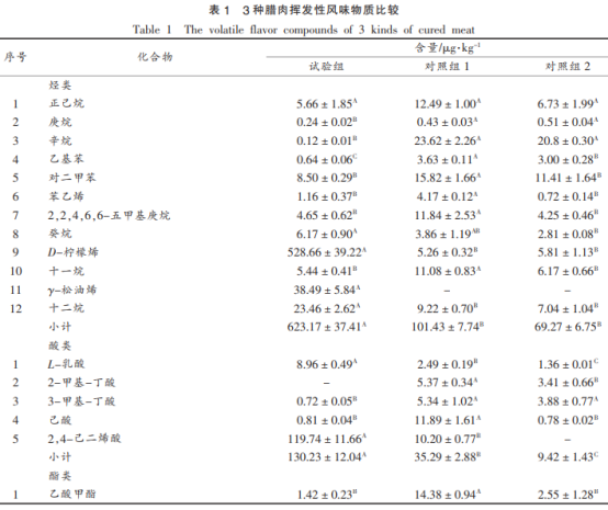 實(shí)驗(yàn)組中國(guó)共產(chǎn)黨評(píng)定出揮發(fā)物成份71種,總成分為2939.68μg/kg,在其中醚類(982.22μg/kg)、氮化合物(623.17μg/kg)、代烴(456.53μg/kg)為關(guān)鍵揮發(fā)物成份。對(duì)照實(shí)驗(yàn)1中國(guó)共產(chǎn)黨評(píng)定出揮發(fā)物成份64種,總成分為1636.28μg/kg,在其中大環(huán)內(nèi)酯(479.50μg/kg)、代烴(445.65μg/kg)、醛類(316.46μg/kg)為關(guān)鍵揮發(fā)物成份。對(duì)照實(shí)驗(yàn)2中國(guó)共產(chǎn)黨評(píng)定出揮發(fā)物成份66種,總成分為667.15μg/kg,在其中大環(huán)內(nèi)酯(382.62μg/kg)、代烴(92.23μg/kg)、氮化合物(69.27μg/kg)為關(guān)鍵揮發(fā)物成份。綜上所述得知,實(shí)驗(yàn)組里揮發(fā)物成份的類別和總成分均為最大。Sidira等發(fā)覺(jué)運(yùn)用干酪乳桿菌ATCC393發(fā)醇臘腸能明顯提升臘腸揮發(fā)物口味化學(xué)物質(zhì)的類別與成分;潘曉倩等將乳酸菌10M-7加上到吹干臘腸中,明顯改進(jìn)和提升風(fēng)干腸的口味。這表明實(shí)驗(yàn)組選用RC4和B6發(fā)醇能推動(dòng)咸肉口味化學(xué)物質(zhì)類別和成分的提升。除此之外,臘肉制作全過(guò)程中腌漬是必需階段,腌漬全過(guò)程還可以具有抗菌防腐蝕的作用,與此同時(shí)還可以提升咸肉的保水溶性,提升咸肉產(chǎn)品的顏色和口味。實(shí)驗(yàn)組腌漬環(huán)節(jié)中增加的紅曲紅與甜菜紅,維生素E和各種各樣調(diào)味料在取代亞硝酸鈉的與此同時(shí),還能提高肉的口味,提升企業(yè)產(chǎn)品的吃用使用價(jià)值。