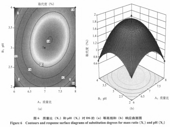 由圖六分析得知,質(zhì)量比與pH的配對t檢驗(yàn)對取代度的危害比較明顯,與實(shí)體模型線性回歸方程結(jié)果中合乎:圖上a圖是等值線,橢圓形平扁,則兩要素對取代度的危害明顯,當(dāng)在較小的橢圓形,上選值時,獲得的取代度是較大;圖上b圖是3D回應(yīng)斜面,更直接的看得出,兩互動要素底邊即等值線平面圖取到貼近核心時,取代度貼近回應(yīng)斜面的頂端即取代度可用到最高值。順著水溶液的pH軸等值線相對密度轉(zhuǎn)變超過質(zhì)量比轉(zhuǎn)變,說明水溶液pH對取代度的危害對比于質(zhì)量比是明顯,這與表2中的剖析一致。pH值較低時KGM水解反應(yīng)為單糖減少了KGM分子結(jié)構(gòu)中間的相互影響有益于酯化反應(yīng),伴隨著pH值的進(jìn)一步上升,聚磷酸鹽的劃分和存有方式發(fā)生了轉(zhuǎn)變 ,對酯化反應(yīng)的開展不好。