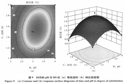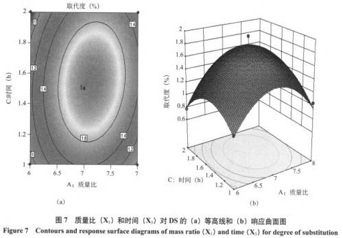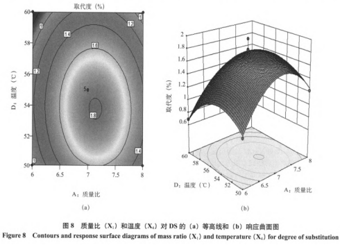 由圖8剖析得知,質(zhì)量比與溫度兩要素配對t檢驗(yàn)對取代度的危害明顯一般,與實(shí)體模型線性回歸方程結(jié)果中合乎:圖上a圖是等值線,橢圓形不足平扁,則兩要素對取代度的危害并不是很明顯,這可能是在其中一個單要素對取代度的危害并不大造成的:圖上b圖是3D回應(yīng)斜面,該斜面頂端不足突顯,也表明兩要素互動對取代度的危害不足顯著。沿反映溫度軸的等值線相對密度轉(zhuǎn)變超過質(zhì)量比的轉(zhuǎn)變,說明反映溫度對EKGM取代度的危害明顯高過質(zhì)量比,與表2的數(shù)據(jù)信息一致。伴隨著反映溫度的上升EKGM的DS先擴(kuò)大后減少,反映溫度過低推動酯化反應(yīng)的水平小造成 取代度??;但溫度過高時已酯化反應(yīng)的EKGM遭受高溫的危害,不穩(wěn)定的酯鍵破裂造成取代度也縮小。