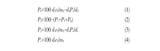 式中:P1為A化學(xué)纖維凈干質(zhì)量濃度(%);P2為B化學(xué)纖維凈干質(zhì)量濃度(%);P3為C化學(xué)纖維凈干質(zhì)量濃度(%);P4為D化學(xué)纖維凈干質(zhì)量濃度(%);m1為第一個(gè)試件溶前干品質(zhì)(g);m2為第二個(gè)試件溶前干品質(zhì)(g);r1為第一個(gè)試件歷經(jīng)第一種實(shí)驗(yàn)試劑融解B、C化學(xué)纖維后,不溶化學(xué)纖維干品質(zhì)(g);r2為第二個(gè)試件歷經(jīng)第二種實(shí)驗(yàn)試劑融解A、B化學(xué)纖維后,不溶化學(xué)纖維干品質(zhì)(g);r3為第二個(gè)試件歷經(jīng)第二、三種實(shí)驗(yàn)試劑融解A、B、C化學(xué)纖維后,不溶化學(xué)纖維干品質(zhì)(g);d1為品質(zhì)損害調(diào)整因素(第一個(gè)試件中,A化學(xué)纖維在第一種實(shí)驗(yàn)試劑中的產(chǎn)品質(zhì)量損害);d2為品質(zhì)損害調(diào)整因素(第一個(gè)試件中,D化學(xué)纖維在第一種實(shí)驗(yàn)試劑中的產(chǎn)品質(zhì)量損害);d3為品質(zhì)損害調(diào)整因素(第二個(gè)試件中,C化學(xué)纖維在第二種實(shí)驗(yàn)試劑中的產(chǎn)品質(zhì)量損害);d4為品質(zhì)損害調(diào)整因素(第一個(gè)試件中,D化學(xué)纖維在第二種實(shí)驗(yàn)試劑中的產(chǎn)品質(zhì)量損害);d5為品質(zhì)損害調(diào)整因素(第一個(gè)試件中,D化學(xué)纖維在第二、三種實(shí)驗(yàn)試劑中的產(chǎn)品質(zhì)量損害)。