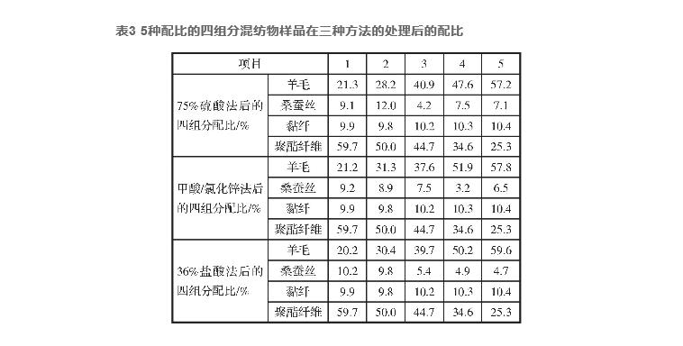 歷經(jīng)測(cè)算,5種配制的四成分混紡布物試品在三種辦法的解決下,四成分的配例如表3所顯示。