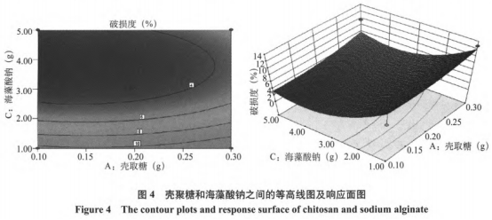 從圖4得知,回應(yīng)斜面的張口往上,表明殼聚糖和海藻酸鈉中間的配制配對t檢驗(yàn)較差,固定不動海藻酸鈉的使用量,殼聚糖的劑量提升對燕麥片顆粒物損壞度基本上無危害;固定不動殼聚糖的使用量,海藻酸鈉的劑量對燕麥片顆粒物損壞度的干擾展現(xiàn)慢慢增加的發(fā)展趨勢。等高線圖中,沿A軸方位的線密度較低,C軸方位的線密度相對性較高,表明海藻酸鈉使用量的危害比殼聚糖的危害更高。