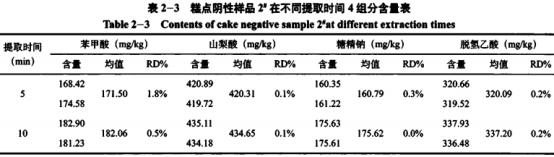 參考國標GB5009:28-2016一般性食品中樣品提取時間,本試驗對不同類別的糕點進行加標試驗來考察樣品提取時間對目標成分提取效率的影響,考察的提取時間分別為5min、10min、20min、30min、40min、50min、60min,稱取糕點、月餅、辣條樣品各3份,精密加入混合標準使用液2.0mL,上機測定,得到4組分在不同提取時間的含量,結果見表2。結果顯示,超聲提取10min,4種目標組分的數值基本達到穩(wěn)定,提取時間為20min所得含量最高,本次試驗最終選擇超聲時間為20min。