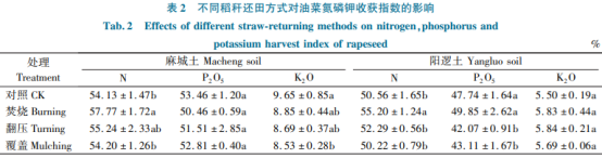 表2結(jié)果顯示,油菜氮磷鉀收獲指數(shù)受稻稈還田方式和土壤類型影響。氮收獲指數(shù)在2種土壤的表現(xiàn)均以焚燒處理最高,分別比CK顯著提高3.64(麻城土),4.64(陽邏土)百分點(diǎn)。磷收獲指數(shù)除陽邏土的焚燒處理略有增加外(比CK提高2.11百分點(diǎn),但差異不顯著),其他處理反而有下降趨勢(shì)。鉀收獲指數(shù)在2種土壤的表現(xiàn)剛好相反,焚燒、翻壓和覆蓋處理,相比CK,麻城土分別下降0.80,0.96,1.12百分點(diǎn),其中覆蓋處理下降顯著,陽邏土分別增加0.33,0.34,0.19百分點(diǎn),但差異均不顯著。稻稈還田雖然能增加油菜對(duì)鉀的總累積量,但由于鉀素主要分配于油菜莖稈、角殼等非經(jīng)濟(jì)部位,油菜氮磷鉀收獲指數(shù)氮>磷>鉀。