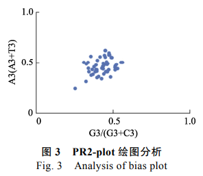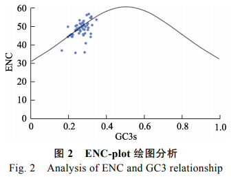 PR2-plot繪圖通過分析密碼子第3位堿基的組成關(guān)系,揭示密碼子使用偏好性的影響因素。由圖3可以看出芒果基因在4個(gè)區(qū)域內(nèi)分布不均勻,多數(shù)分布于平面圖的左下方。T和C在密碼子第3位出現(xiàn)的頻率較高,G與C、A與T的使用頻率不相等,T的使用頻率高于A,C的使用頻率高于G,嘧啶的使用頻率高于嘌呤,說明突變不是影響芒果密碼子使用偏好性的唯一因素,選擇等其他因素對(duì)芒果密碼子使用偏好性也產(chǎn)生一定的影響。