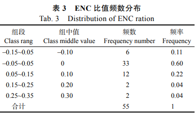 ENC-plot繪圖以ENC比值[(預(yù)期ENC值~實(shí)際ENC值)/預(yù)期ENC值]和ENC比值頻數(shù)判斷偏好性影響因素,揭示ENC與GC3s的關(guān)系,反映堿基組對(duì)密碼子偏好性的影響程度?;蜃鴺?biāo)點(diǎn)離標(biāo)準(zhǔn)曲線的距離近且數(shù)量較多說明偏好性主要受到突變的影響;反之說明偏好性受選擇的影響較大。圖2結(jié)合表3顯示60%共33個(gè)基因分布在–0.05~0.05之間,這33個(gè)基因的實(shí)際ENC值與預(yù)期ENC值接近,與標(biāo)準(zhǔn)曲線的距離較近,分布在–0.05~0.05之外的基因有22個(gè),這22個(gè)基因與預(yù)期ENC值較遠(yuǎn),在標(biāo)準(zhǔn)曲線較遠(yuǎn)的位置。說明芒果基因組密碼子偏好性與GC3的差異有關(guān),突變對(duì)芒果葉綠體基因組密碼子偏好性的影響較大。