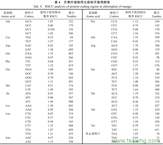 利用codonW軟件對(duì)芒果55條基因序列的RSCU值進(jìn)行計(jì)算(表4)。結(jié)果顯示RSCU>1的密碼子共31個(gè),出現(xiàn)頻率相對(duì)較高的是以A(13個(gè))或T(16個(gè))結(jié)尾的密碼子,是芒果基因組偏愛;以G(1個(gè))或C(1個(gè))結(jié)尾的密碼子出現(xiàn)的頻率較低且RSCU值多小于1,說明這些是基因組非偏好的密碼子。
