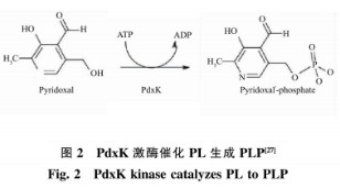但是大腸桿菌為非食品安全菌株,在發(fā)酵過程中易產(chǎn)生內毒素,并且需要添加價格昂貴且有毒害作用的IPTG作為誘導劑誘導產(chǎn)酶,其生產(chǎn)得到的GAD安全性不高,距離滿足食品和醫(yī)藥領域的要求還有一定差距。枯草芽孢桿菌是通過美國食品和藥物管理局GARS認證的安全菌株,廣泛應用在食品、醫(yī)藥生產(chǎn)中。然而在枯草芽孢桿菌中缺少PdxH,所以無法利用添加輔酶前體PN的方式,通過PLP補救途徑將PN轉化為PLP,從而提高GAD酶活力。目前,大量的研究集中在以枯草芽孢桿菌為宿主生產(chǎn)GAD,在酶轉化過程中通過直接添加輔酶PLP提高轉化效率,如丁偉等運用安全宿主枯草芽孢桿菌生產(chǎn)GABA,在其轉化過程巾直接添加PLP,全細胞催化GABA產(chǎn)量為239.91g/L,轉化率54.48%。由于PLP價格昂貴,導致生產(chǎn)成本較高,無法適應工業(yè)化生產(chǎn)需求。關于在枯草芽孢桿菌為宿主生產(chǎn)GAD發(fā)酵過程中,添加價格低廉的輔酶前體以提高GAD酶活力的研究未見報道。因此作者以枯草芽孢桿菌(Bacillussubtilis)為宿主,通過基因工程將大腸桿菌來源的谷氨酸脫羧酶基因(gadB)在B.sMbtilis中異源表達,添加相對廉價的輔酶前體PL,通過PdxK介導的PLP補救途徑將其轉化生成PLP(見圖2),從而提高酶活和產(chǎn)量,降低生產(chǎn)成本。