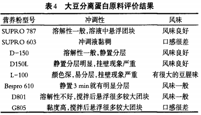 對(duì)8種型號(hào)規(guī)格的黃豆分離蛋白(SUPRO787、SU-PRO603、D-150、D150L、L-100、Bespro610、D801、G805)的口味、沖特性點(diǎn)評(píng)結(jié)果見(jiàn)表4。