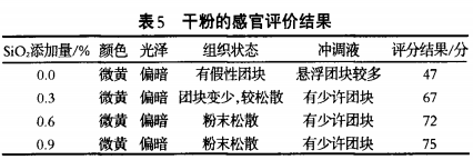 因商品中的粉劑機(jī)構(gòu)情況存有低回聲區(qū)難題。試驗(yàn)設(shè)計(jì)在商品中加入抗結(jié)劑二氧化硅,加上量分別為0.3%、0.6%、0.9%,依據(jù)感觀實(shí)驗(yàn)結(jié)果,明確二氧化硅加上量為0.6%。感觀點(diǎn)評(píng)結(jié)果如表5。