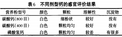 三種原材料點(diǎn)評(píng)數(shù)據(jù)顯示(見(jiàn)表6),碳酸氫鈣(400目)與碳酸氫鈣(800目)沖泡特性最好是,融解后杯內(nèi)沉積較少,磷酸氫鈣融解后及其靜放3min后沉積較多。綜合性考慮到碳酸氫鈣(800目)在商品混和時(shí)發(fā)生報(bào)團(tuán)難題,故選用碳酸氫鈣(400目)做為鈣的來(lái)源于。