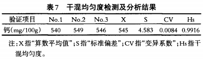 干混完畢后,依據(jù)倒粉次序任意取三點(diǎn)對(duì)研發(fā)商品抽樣,檢驗(yàn)鈣成分,檢驗(yàn)結(jié)果見(jiàn)表7。認(rèn)證結(jié)果顯示試品的干混勻稱度為99.16%,從而可確定本次試產(chǎn)試品混和是均勻分布的。