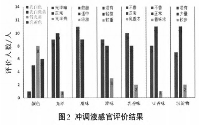 研發(fā)試品沖泡液點(diǎn)評(píng)結(jié)果:高鈣奶營(yíng)養(yǎng)成分蛋白粉沖泡濃度值為25g/200mL,沖泡液色調(diào)為黃棕色,光澤度發(fā)暗,豆香氣一切正常,清甜味甜甜的,沒(méi)有乳香氣,有略微的苦澀味和苦澀味,融解后有小量沉淀。實(shí)際點(diǎn)評(píng)結(jié)果如圖2所顯示。