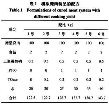 原材料肉攪碎—添加調料斬拌—腌漬(24h)—罐裝—85℃加溫一制冷一冷凍儲存。榮譽出品率差異的豬肉皮膠原腌肉食品秘方詳細表1。