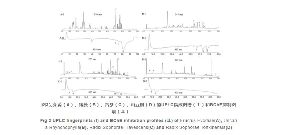 應(yīng)用UPLC-DAD-BCD方式對(duì)吳茱萸、鉤藤、玄參和山豆根(苗)提取液中的BChE緩聚劑開(kāi)展挑選結(jié)果見(jiàn)圖3。吳茱萸中有4個(gè)峰在405 nm檢測(cè)中表明倒峰,說(shuō)明具備BChE抑止活力。鉤藤中有3個(gè)倒峰、玄參中有五個(gè)倒峰、山豆根(苗)中有兩個(gè)倒峰。在其中吳茱萸中的11號(hào)峰表明極強(qiáng)的BChE抑止活力。線上統(tǒng)計(jì)分析方法因?yàn)槭橇魍ㄐ缘姆从硻z驗(yàn),更能迅速發(fā)覺(jué)活力較強(qiáng)、酶抑止速度更快的成份。