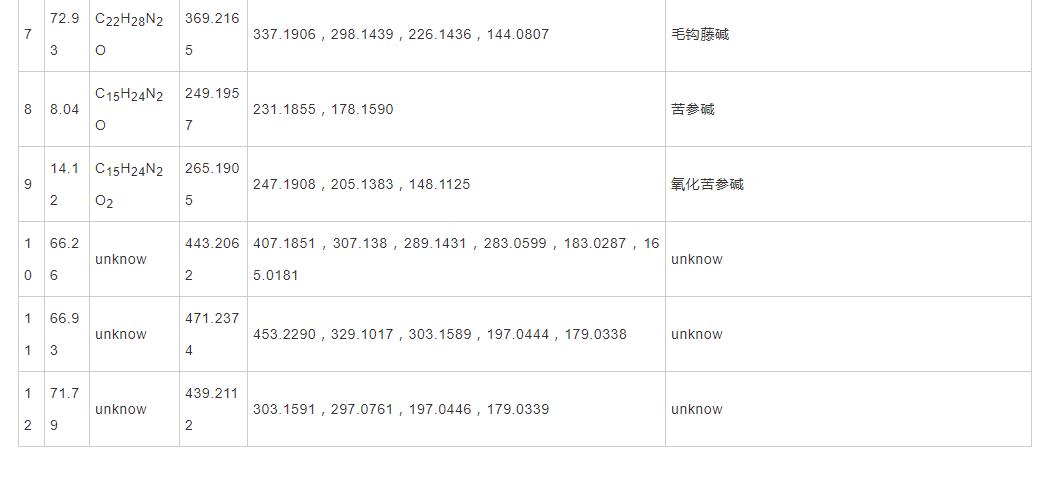 化學(xué)物質(zhì)9:來(lái)自玄參和山豆根(苗),保存期14.12 min,共價(jià)鍵方式,其準(zhǔn)分子離子為m/z265.190 5 ,二級(jí)質(zhì)譜分析表明其關(guān)鍵殘片m/z247.190 8 ,m/z205.138 3 ,m/z 148.112 5 融合參考文獻(xiàn)基本推斷化學(xué)物質(zhì)9為氧化苦參堿。