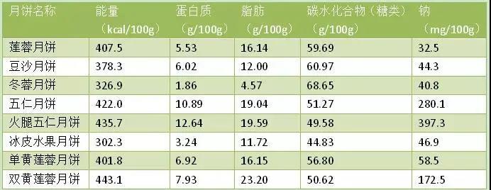 ▲ 幾種普遍月餅的營養(yǎng)元素平均值