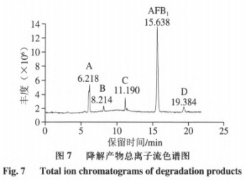如圖所示7所顯示,AFB1經(jīng)漆酶溶解后檢驗到4個新的色譜儀峰,由峰形和分離度可看得出,各物質(zhì)分離出來實際效果不錯,且由保存期不一樣推斷溶解物質(zhì)不一樣。依據(jù)AFB1和溶解物質(zhì)的保存期分辨5種化學物質(zhì)的正負極尺寸為A>B>C>AFB1>D。