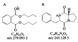 AFB1關(guān)鍵由4個不一樣的溶解功效結(jié)構(gòu)域:1)香豆素內(nèi)酯環(huán)不穩(wěn)定,在外部標準下能脫羰基)能與核苷酸、蛋白等融合的咪唑環(huán)烴基和H2O、H等產(chǎn)生加成反應。3)環(huán)戊烯酮環(huán)根據(jù)加成反應、取代反應危害AFB1的毒副作用。4)苯環(huán)上的-0CH3能夠與-OH、H、-CHO產(chǎn)生取代反應。與此同時,AFB1的一部分溶解物質(zhì)中間還可以互相轉(zhuǎn)換。如圖所示8A所顯示,溶解物質(zhì)A在撞擊中造成[M H] 為m/z279.0932的磷酸激酶正離子,依據(jù)高分辨質(zhì)譜結(jié)果線性擬合的化學結(jié)構(gòu)式為C16H22O4,與此同時造成[M H] 為m/z201.0465、149.0236、121.0311的特點殘片正離子。依據(jù)二級質(zhì)譜分析特點正離子m/z149,并運用Scifinder和Reaxy數(shù)據(jù)庫查詢查找。由溶解物質(zhì)A的特點殘片正離子[M H] 為m/z149.0236推斷的結(jié)構(gòu)特征與Samuel等分析出的Pseudomonasputida溶解AFB1獲得的AFD3物質(zhì)構(gòu)造一致,而且經(jīng)試驗認證該化學物質(zhì)對Hela體細胞的毒副作用遠低于AFB1。如圖所示8B所顯示,溶解物質(zhì)B在撞擊中造成[M H] 為m/z245.1282的磷酸激酶正離子,依據(jù)高分辨質(zhì)譜結(jié)果線性擬合的化學結(jié)構(gòu)式為C14H16N2O2,與此同時造成[M H] 為m/z217.1332、120.0811、154.0735、70.0680的特點殘片正離子。依據(jù)二級質(zhì)譜分析特點正離子m/z271,推斷該化學物質(zhì)構(gòu)造中存有一個羰基,并運用Scifinder和Reaxy數(shù)據(jù)庫查詢查找。如圖所示8C所顯示,溶解物質(zhì)A在撞擊中造成[M H] 為m/z197.1145的磷酸激酶正離子,依據(jù)高分辨質(zhì)譜結(jié)果線性擬合的化學結(jié)構(gòu)式為C7H12N6O1與此同時造成[M H] 為m/z70.0678的特點殘片正離子。依據(jù)二級質(zhì)譜分析特點正離子,推斷該化學物質(zhì)中有吡咯烷構(gòu)造,并運用Scifinder和Reaxy數(shù)據(jù)庫查詢查找。如圖所示8D所顯示,溶解物質(zhì)C在撞擊中造成[M H] 為m/z415.2427的磷酸激酶正離子,依據(jù)高分辨質(zhì)譜結(jié)果線性擬合的化學結(jié)構(gòu)式為C24H30O6,與此同時造成[M H] 為m/z397.1455、109.0863的特點殘片正離子。依據(jù)二級質(zhì)譜分析特點正離子m/z397和m/z109,推斷該化學物質(zhì)構(gòu)造中存有一個甲基和苯甲醇結(jié)構(gòu)單元,并運用Scifinder和Reaxy數(shù)據(jù)庫查詢查找。AFB1經(jīng)漆酶溶解后的各物質(zhì)構(gòu)造見圖9。