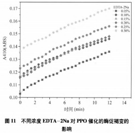 (8)測量不一樣濃度值EDTA-2Na對土豆PPO催化反應(yīng)的酶促褐變的危害